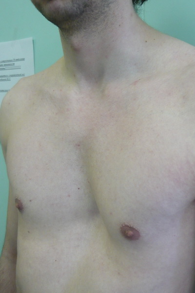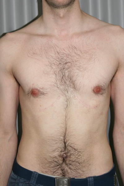 Пациент М., 23 лет с воронкообразной грудной клеткой 2 степени, асимметричной левосторонней формы. Фото через 2 года после операции |