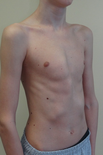 Пациент Е., 13 лет с килевидной деформацией грудной клетки, асимметричной правосторонней формы. Фото через год после операции |
