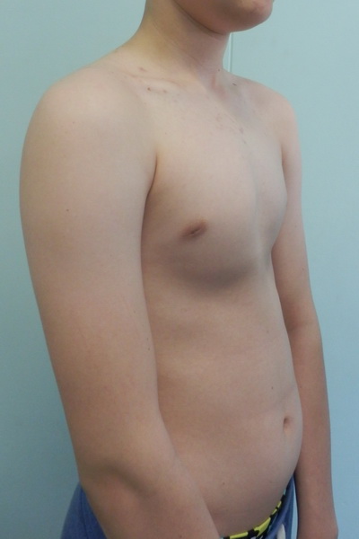 Пациент А., 13 лет с килевидной деформацией грудной клетки, симметричной формы. Фото через 6 месяцев после операции. |