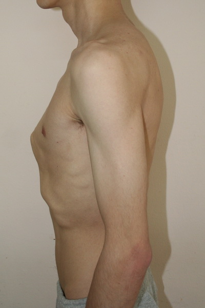 Пациент А., 13 лет с килевидной деформацией грудной клетки, симметричной формы. До операции по исправлению килевидной деформации. |