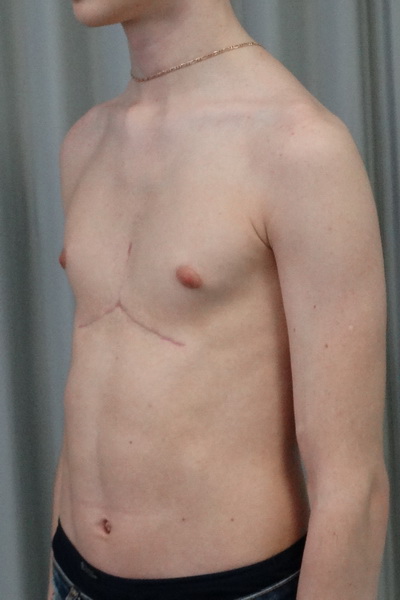 Пациент А., 15 лет с килевидной деформацией грудной клетки, симметричной формы через 5 месяцев после операции. |