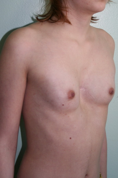 Пациентка В., 17 лет с рецидивом воронкообразной деформации ГК, развившейся после операции Палтиа (операция типа Равича с фиксацией грудино-реберного комплекса титановой пластиной) и ее удаления через 6 месяцев. Фото до повторной хирургической коррекции воронкообразной деформации грудной клетки. |